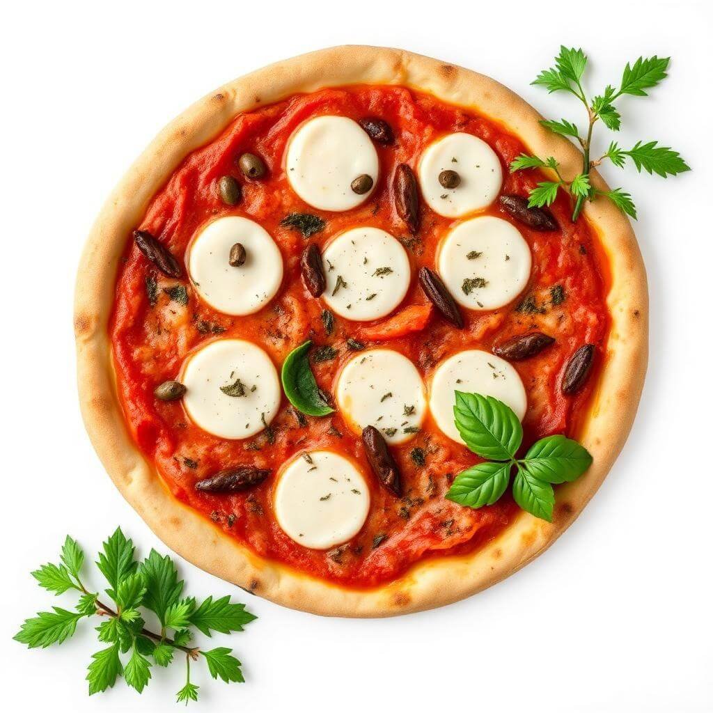 It features a rich San Marzano-style tomato sauce layered with creamy mozzarella cheese, savory anchovies, and premium black olives. Finished with aromatic oregano and a drizzle of extra virgin olive oil, every bite delivers a perfect balance of salty, tangy, and herbaceous flavors.