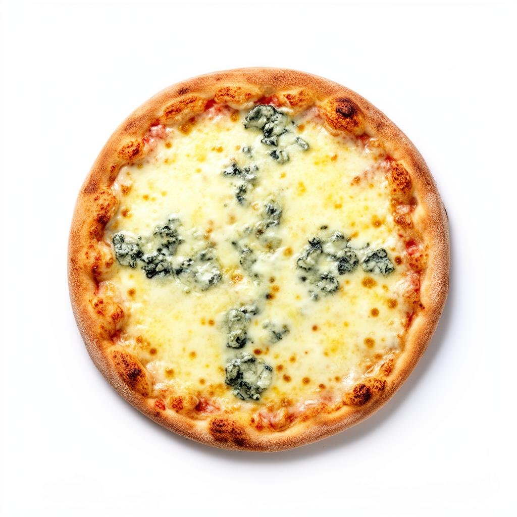 A rich and creamy Italian pizza topped with a blend of four cheeses—mozzarella, gorgonzola, parmesan, and emmental—on a golden, crispy crust.